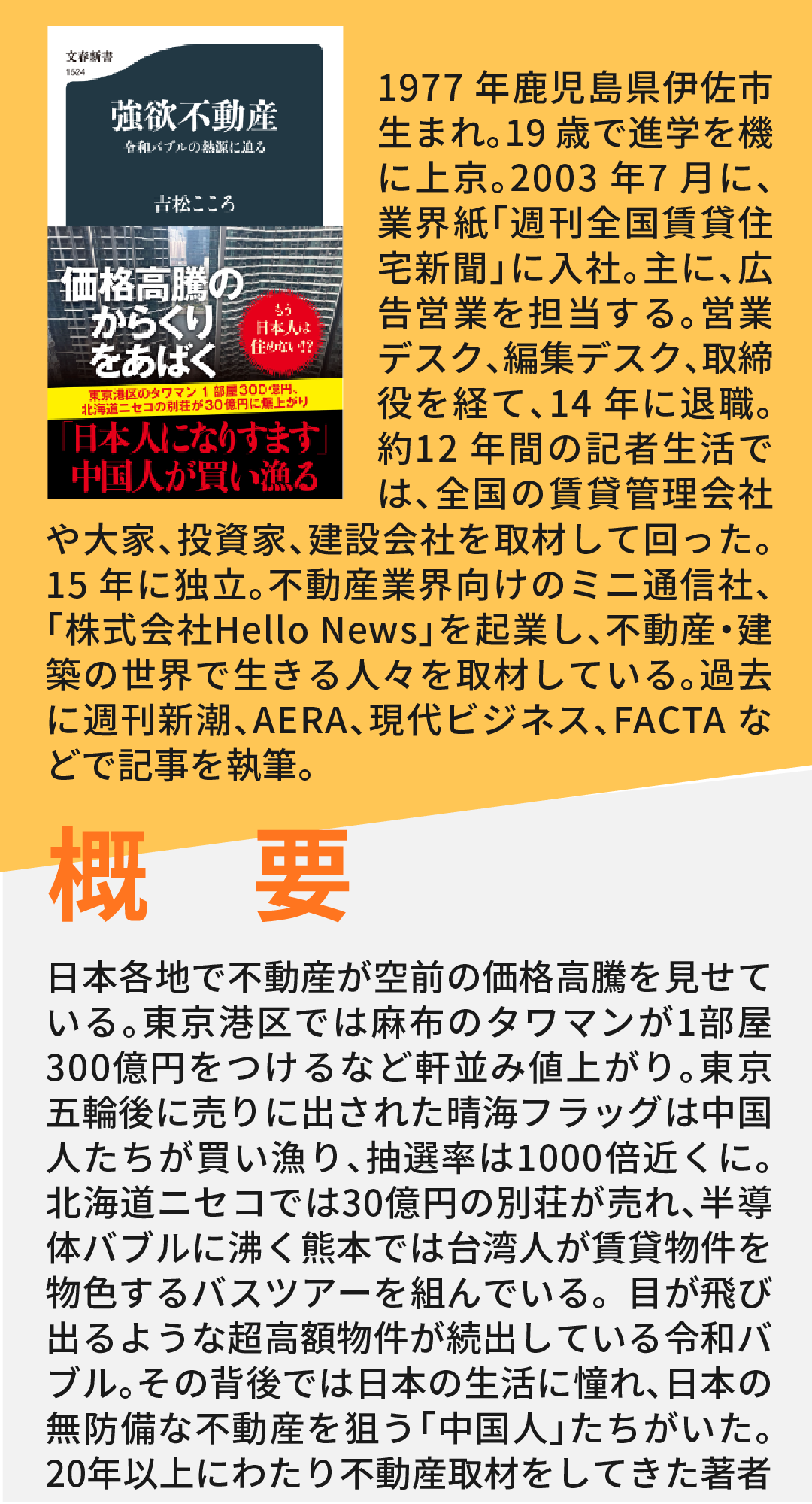 1977 年鹿児島県伊佐市生まれ。19 歳で進学を機に上京。2003 年7 月に、業界紙「週刊全国賃貸住宅新聞」に入社。主に、広告営業を担当する。営業デスク、編集デスク、取締役を経て、14 年に退職。約12 年間の記者生活では、全国の賃貸管理会社や大家、投資家、建設会社を取材して回った。15 年に独立。不動産業界向けのミニ通信社、「株式会社Hello News」を起業し、不動産・建築の世界で生きる人々を取材している。過去に週刊新潮、AERA、現代ビジネス、FACTA などで記事を執筆。