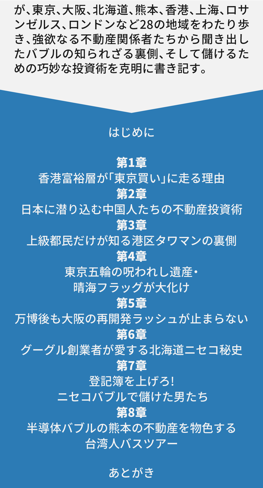 20年以上にわたり不動産取材をしてきた著者が、東京、大阪、北海道、熊本、香港、上海、ロサンゼルス、ロンドンなど28の地域をわたり歩き、強欲なる不動産関係者たちから聞き出したバブルの知られざる裏側、そして儲けるための巧妙な投資術を克明に書き記す。